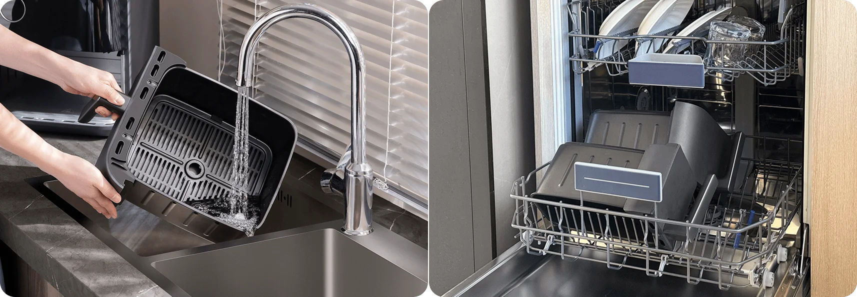 Левая корзина на 3,5 литра отлично подойдёт для гарниров и лёгких блюд, а правая на 6,5 литра рассчитана на крупные продукты — например, целую курицу. Такая комбинация позволяет готовить разнообразное меню за один цикл, не перегружая кухонное пространство.