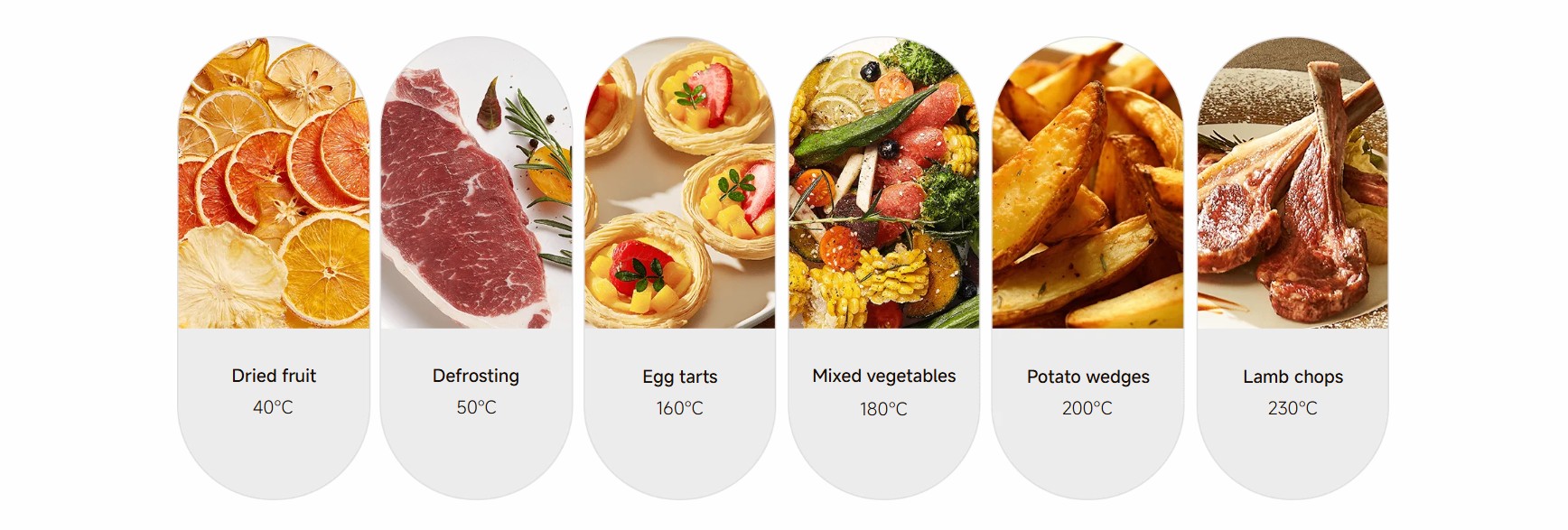 Аэрогриль поддерживает до 230°C для жарки и запекания, а также 40–60°C для размораживания, ферментации или сушки фруктов. Это универсальный помощник, который заменяет сразу несколько кухонных приборов.